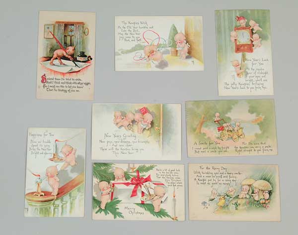LOT OF EIGHT SCARCE ROSE O’NEIL KEWPIE POSTCARDS Christmas, rainy day, happiness with candles, kewpie wish, New Year’s luck, a smile for you, New Year’s greeting, and the eighth kewpie card not by Rose O’Neil, depicts a kewpie figure writing a letter. CONDITION: Generally excellent; only two have notes on the back, the rest are unused. 1-642 (150-250) Auction: Advertising, Toy & Doll - Spring 2003 Please Note: All prices include the hammer price plus the buyer’s premium, which is paid by the buyer as part of the purchase price. The prices noted here after the auction are considered unofficial and do not become official until after the 46th day. |