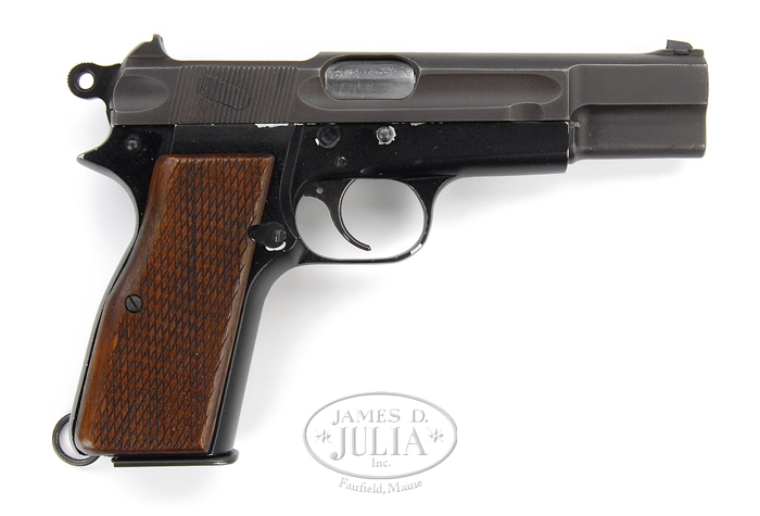 *RARE PROTOTYPE OF A CANADIAN HI-POWER. SN None. Cal. 9 mm. This is a prototype or experimental of a Browning Hi-Power made by Inglis, Canada. It incorporates a standard size of a Browning Hi-Power with a light weight alloy frame with black enamel for a finish. The slide is similar to the Canadian Hi-Power with the rear sight being an intrical part of the slide. This also has lightening grooves in the two sides as well as a lightening groove in the top side. It has checkered wooden grips with a standard Canadian Hi-Power magazine and a lanyard loop. PROVENANCE: Stern Collection. CONDITION: Frame retains approximately 90% of the black enamel in which it was painted with some nicks on the high edges as well as a small scratch on the front strap. Slide is a mat dark gray Parkerizing that retains about 98% of its finish and just a little wear around the muzzle. Mechanically crisp with a bright and shiny bore and what appears to be possibly a one of a kind Hi-Power. 4-34145 BK109 (3,500-4,500)