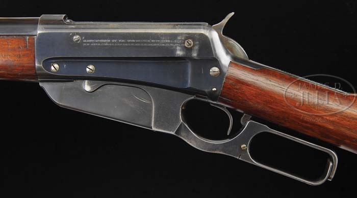Additional Information: Accompanied by Factory Letter, not in description, confirming configuration. *WINCHESTER MODEL 95 STANDARD GRADE LEVER ACTION RIFLE. SN 38452. Cal. 35WCF. 24″ rnd bbl, pedestal front with Lyman ivory bead hunting sight, sporting rear sight with set screw. Left side of bbl is marked “NICKEL STEEL BARREL / ESPECIALLY FOR SMOKELESS POWDER”, top center adjacent receiver “35 W.C.F.”. Standard receiver with tapped holes for Lyman lever side sight on left side with filler screws. Top tang marked “WINCHESTER / MODEL 1895”. Mounted with streaky straight grain walnut, Winchester hard rubber buttplate, schnable with ebony tip insert. PROVENANCE: Herbert G. Wellington Jr. Estate. CONDITION: Very fine. Bbl retains 97-98% original blue with some minor scratches and tiny nicks and dings. Receiver retains 95% original blue with some minor scratching, lightly thinning top rear of right side and an outline on left side of Lyman lever sight. Stock is sound with minor nicks and dings, most of its original finish thinning in toe line. Forend is sound with minor nicks and dings, 70% original finish blending with hand worn patina across bottom. Mechanics are crisp with bright shiny bore. 4-38553 BDT155 (1,500-2,500)