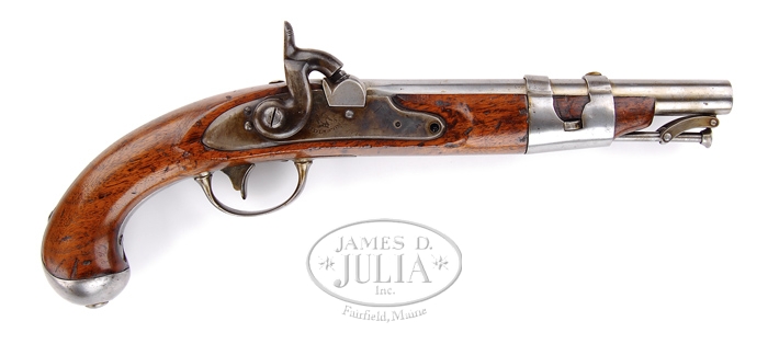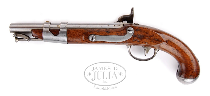 UNUSUAL COMPOSITE PERCUSSION SINGLE SHOT PISTOL SN NSN. Cal. 54. Strange pistol with 9-1/8” rnd bbl, obviously cut when conversion was made. It has an upside down perpendicular “US” and a parallel “P” at the rear end of bbl. It has the square base bolster of the 1842 percussion pistol with captive rammer. Mounted in 1-pc walnut stock with iron furniture having a split front band with integral brass sight and an “X” inspector initial on left side. It has a flat “J” side plate with long backstrap and rnd buttcap with 2-pc trigger guard. Lockplate is by Simeon North that has “S. NORTH” in a downward curve over an American eagle with “U” and “S” on either side and “MIDLN CON” in an upward curve below. It is apparent that the date was removed from tail and that the bolster cut in lock has removed part of the maker’s name. CONDITION: Very good. All bright metal has been professionally & carefully cleaned & polished. Lockplate & hammer retain generous amounts of strong case colors. Wood is sound with nicks & dings and retains about 75% orig finish. Mechanics are fine. 4-33310 JR577 (1,250-1,750)