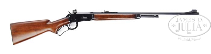 *WINCHESTER MODEL 64 STANDARD GRADE LEVER ACTION RIFLE. SN 1410288. Cal 32 WIN. SPECIAL. 24-1/4″ bbl, 2/3 magazine, integral stippled ramp, fine bead sight with sight hood, 22 series rear sight. Left side bbl marked “MADE IN NEW HAVEN. CONN. U.S. OF AMERICA / WINCHESTER PROOF STEEL – WINCHESTER / TRADEMARK – MODEL 64 – 32 W.S.” Standard receiver with left side mounted Redfield peep sight. Mounted with nicely figured straight grain walnut, pistol grip, checkered steel buttplate, standard forend with nosecap. PROVENANCE: Herbert G. Wellington Jr. Estate. CONDITION: Extremely fine, as gun appears to be test fired only. Bbl, magazine and nosecap retain 99% of it’s orig factory blue with a couple minor storage or handling marks. Receiver retains 99% of it’s orig factory blue with a few minor storage or handling marks. Stock is sound with a few minor storage or handling marks, retaining virtually all it’s orig finish. Forend is sound with a few minor marks, a couple of shallow light scratches on right side, retaining virtually all it’s orig factory finish. Mechanics are crisp with bright shiny bore, as gun appears test fired only. 4-38574 BDT123 (1,250-1,750)