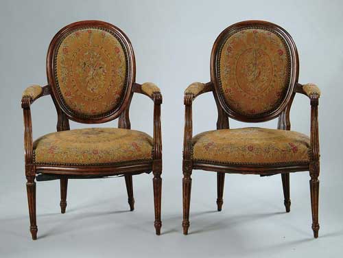 FINE PAIR OF NEEDLEWORK FRENCH ARMCHAIRS. Appears to be in walnut, 19th/20th Century. Open arm form with oval backs and over upholstered seats. Fine needlework upholstery with roses and leaves. SIZE: 35-1/2” h x 23” across front x 17” seat h. CONDITION: Very good, arms and seat fronts have wear. 9-99511 (1,000-1,500)