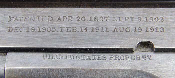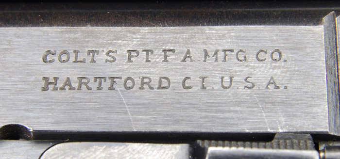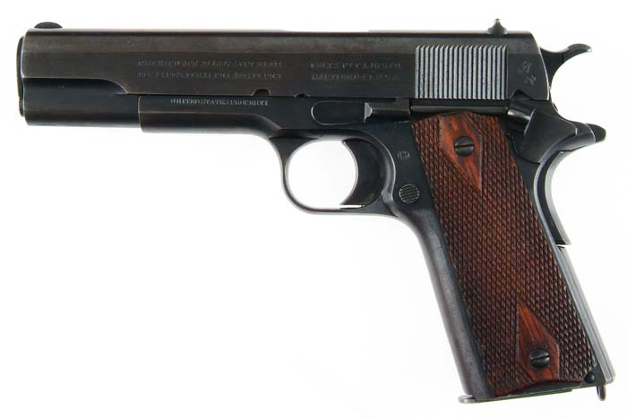 *RARE USMC CONTRACT COLT MODEL 1911 SEMI-AUTO MILITARY PISTOL. Cal. 45 ACP. SN 209724. This pistol is one of only approx. 8,350 contracted by the Marine Corps prior to and during WWI. Usual configuration with 5” “P” & “H” proofed bbl and diamond checkered walnut grips. It has the Gilbert H. Stewart inspector mark on left side of frame. Accompanied by a flat base 2-tone magazine. This pistol was in the 1917 third USMC Contract. CONDITION: Fine to very fine. Slide retains 90-92% orig blue, slightly thinned over top. Frame retains about 85% orig blue, strong & bright on sides, thin & turning brown on front strap, strong grip safety with a gray spring housing. Grips are fine, show light to moderate wear, heavier on right side with a few chipped diamonds. Magazine retains 75-80% orig blue. Mechanics are fine, strong bright bore with some fine pitting at muzzle end. 4-30035 JR96 (3,000-4,500)