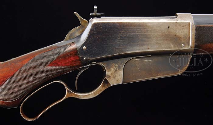 RARE WINCHESTER MODEL 1895 FLATSIDE DELUXE LEVER ACTION RIFLE. SN 3650. Cal. 30US (30-40). 28″ bbl, pedestal front with pinned tall fine bead gold sight, no provision for rear sight. Top of bbl is marked “MANUFACTURED BY THE / WINCHESTER REPEATING ARMS CO. NEW HAVEN CONN. U.S.A.”. Top of bbl at receiver is stamped “30.U.S.”. Early flatside receiver, left side mounted with Lyman lever sight, rear tang is marked “WINCHESTER MODEL 1895”. Mounted with streaky straight grain walnut, checkered pistol grip, Winchester hard rubber grip cap, checkered steel buttplate, single diamond checkered schnable forend with ebony tip insert. Inspection of inside lower tang reveals assembly number “3848CFS”, the matching “3848” number is found under buttplate stamped in stock. PROVENANCE: Ted Knee Collection. CONDITION: Fine. Bbl retains 85-90% original blue with minor muzzle wear, some nicks and dings, some areas of minor thinning blending with brown patina and about a 2″ area at forend with some minor, shallow surface oxidation. Receiver retains 75-80% original blue, stronger on left side, thinning on right and over top blending with silver and brown patina. Lever has flaked and carries a silver and brown patina. Bottom of mag box has thinned and blending with silver and brown patina. Hammer retains most of its dark, original case colors as well as trigger link. Stock is sound with slightly worn checkering, small chip at upper left side of tang, smaller chip on right side, typical nicks and dings, four notches behind grip cap and retains 90% of its original factory finish. Forend is sound with moderately worn checkering, a dark streak along right side, some minor nicks and dings. Retains some original finish blending with hand worn patina. Mechanics are crisp with dull bore with some fine scattered pitting in the grooves. 4-36632 BDT145 (4,000-7,000)