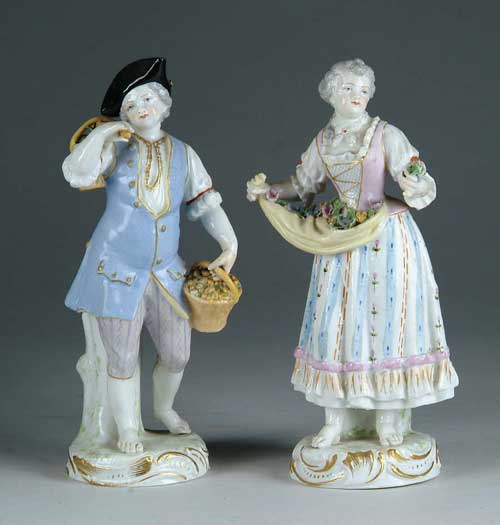 PAIR OF MEISSEN FIGURINES. Figure of man holding basket over shoulder and basket in hand wearing blue outfit. The other a woman with apron full of flowers and flowers in hand. Blue sword mark to base. SIZE: 8” h. CONDITION: Man has restoration to hand and basket handles. Otherwise good. 9-96637 (550-750)