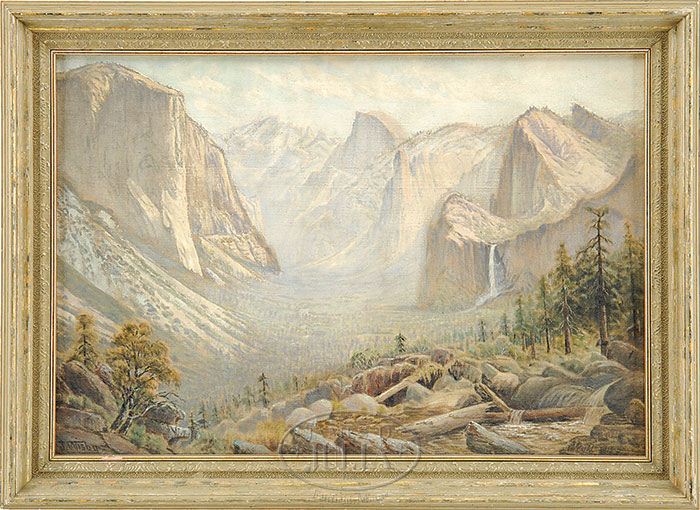 JACK WISBY (American 1869-1940) “YOSEMITE VALLEY”. Oil on canvas board panoramic view looking down a huge canyon valley. Signed lower left. Housed in a modern wood frame with gold liner. SIZE: 14-1/2″ x 21″. CONDITION: Very good. 9-27097 (1,000-1,500)