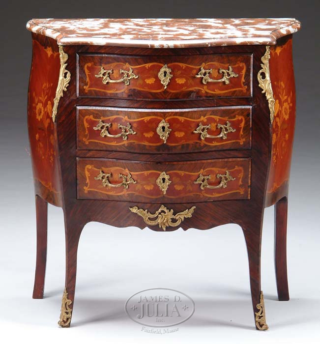 MARBLE TOP FRENCH STYLE THREE DRAWER CHEST. Serpentine front has three drawers with colorful inlaid drawer fronts with flower motif. Ormolu handles and escutcheon plates. Curving legs with ormolu mounts at top and bottom. Serpentine sides have large panels of matched veneers with inlaid spray of flowers. Fine gray and red molded edge shaped marble. 19th/20th Century. Fine quality. SIZE: 32-1/2” h x 31” w x 15” d. CONDITION: Very good. 9-71643 (1,000-2,000)