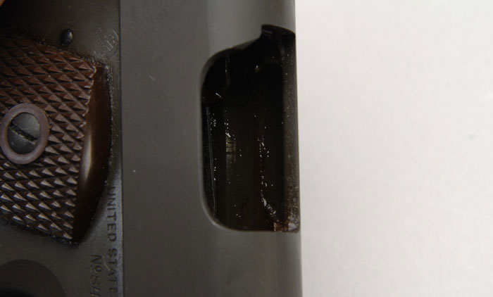 COLT M1911A1. Cal. 45. SN 846569. 5” rnd bbl. Made in 1942 with “WB” cartouche below takedown lever. Has two-tone Parkerizing, darker on front of slide than the rear. Unmarked blue magazine. Brown plastic grips. CONDITION: Excellent with slight wear to the blue on bbl in ejection port. Minor wear around front of slide and on lip of magazine. Grips are sharp. Action is crisp. 4-30984 FS186 (1,250-1,750)