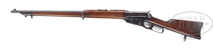 WINCHESTER MODEL 1895 MUSKET. SN 25654. Cal. 30 US (30-40). 28″ bbl, pedestal front with pinned blade sight, military stair step ladder rear sight with hand guard. Under hand guard bbl is marked “NICKEL STEEL BARREL/ESPECIALLY FOR SMOKELESS POWDER” and “30 U.S.” at top center adjacent receiver. Standard receiver with left side marked “MANUFACTURED BY THE WINCHESTER REPEATING ARMS CO./NEW HAVEN.CONN.U.S.A. PAT. NOV.5.95.NOV.12.95.AUG.17.97.JAN.25.98.AUG.23.98”. Top tang is marked “WINCHESTER/1895”. Left side of lever has three initial stamp but is not legible. Mounted with dark straight grain walnut, straight grip, steel carbine buttplate with trap door, inlet sling swivel base with detachable swivel, 24-3/4″ forend, front band with bayonet lug and stacking swivel, rear band with fixed loop swivel, finger grooves on both sides below rear sight. CONDITION: Fine. Bbl retains orig blue toning to brown patina with areas behind front sight and front bbl band that have been cleaned and blending with silver and brown patina. Blue is bright under handguard. Receiver retains 50% orig blue, blending with brown/silver patina, some minor scratches and areas of shallow surface oxidation. Stock is sound with characteristic nicks, dings & scratches, retaining an open grain oil finish, blending with hand worn patina in grip area. Forend is sound with expected nicks, dings & scratches, retaining strong orig oil finish. Mechanics are crisp with a nice shiny bore. 4-37607 BDT168 (3,000-3,500)