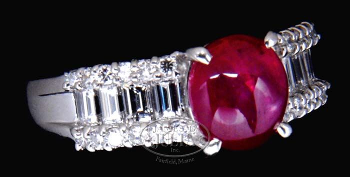 DIAMOND AND STAR RUBY PLATINUM LADIES RING. The central cabochon ruby having a 2.76 carat size flanked by 24 round cut small diamonds and 10 rectangular cut diamonds, total weight .79 carats. The ring marked “PT900 2.76 D 0.79.” RING SIZE: 7 CONDITION: Very good. 9-90483 SM (2,000-2,500)
