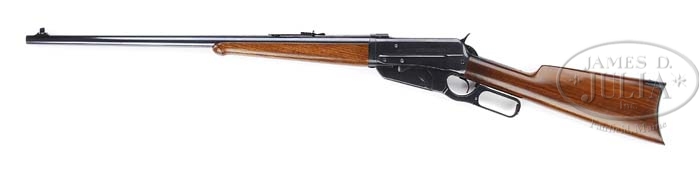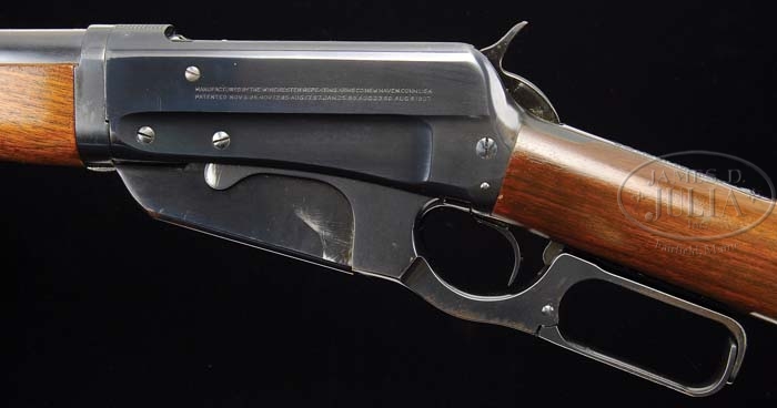 *STUNNING WINCHESTER 1895 TAKEDOWN LEVER ACTION RIFLE. SN 410348. Cal. 30 Govt. 06. 24″ bbl, pedestal front with blade sight with set screw, flat top sporting rear, left side of bbl at rear sight marked “NICKEL STEEL BARREL / ESPECIALLY FOR SMOKELESS POWDER – 30 GOV’T-06”. Standard receiver with takedown ring, left side is marked “MANUFACTURED BY THE WINCHESTER REPEATING ARMS CO. NEW HAVEN. CONN. U.S.A. / PATENTED NOV. 6. 95. NOV. 12. 95. AUG. 17. 97. JAN. 25. 98. AUG. 23. 98. AUG. 6. 1907”. Winchester proof marks can be found on top left receiver and top center of adjacent bbl. Rear tang is stamped “MODEL 95/WINCHESTER/TRADEMARK REG. U.S. PAT OFF & FGN.” Mounted with streaky strain grain walnut, straight grip, crescent steel buttplate, schnable forend with ebony tip insert. CONDITION: Extremely fine. Very near new. Bbl retains 99% original blue finish with a few tiny storage marks. Receiver retains 99% original factory blue with a couple of small spots flaked and blending with brown patina. Takedown ring retains 98% original blue with a few small spots flaked, blending with brown patina, bolt has a couple of spots flaked, blending with brown patina, mag box has some minor rub marks with front flaked and blending with brown patina, lever has most of its original blue with rub mark on ears, flaking across bottom and blending with brown patina. Stock is sound with some minor handling marks, a tiny chip on lower left side at receiver and retaining virtually all of its original finish. Buttplate has 50% original blue flaking and blending with brown patina and toe showing silver from cleaning. Forend is sound with minor handling marks and retains virtually all of its original finish. Mechanics are crisp with bright shiny new bore. 4-38385 BDT147 (3,500-4,500)