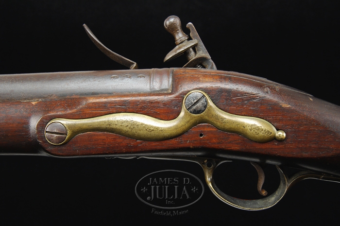 AMERICAN STOCKED BROWN BESS MILITIA MUSKET/FOWLER SN NSN. Cal. 80. American made fowler using most of parts from a first model Brown Bess flintlock musket with 46-1/4” round bbl, bayonet lug atop muzzle with three oval British proofs at breech end & engraved on top “NO 16”. It has the first model rounded lockplate, 6-7/8” long with a short teat, moderately curved, engraved in front of hammer “R / WATKIN”. It has a bridled frizzen with rounded gooseneck hammer. It has brass furniture with three short brass guides and a long nosepipe with the Brown Bess trigger guard bearing number “13”. It has the long, rnd first model Brown Bess sideplate. Fitted with a replacement buttplate with short 2-step tang with pointed ends. Mounted in a heavy Brown Bess shaped walnut stock but substantially heavier & thicker. It has a brass forend tip with no provision for sling wire in forestock and sling wire removed from trigger guard. CONDITION: Fine. Iron retains a dark chocolate brown patina with moderate pitting. Brass is a very dark patina in most areas, lighter in hand contact areas. Stock has a repaired crack by top tang, otherwise wood is sound with a dark hand worn patina. Mechanics are fine. 4-32761(5,000-7,000)