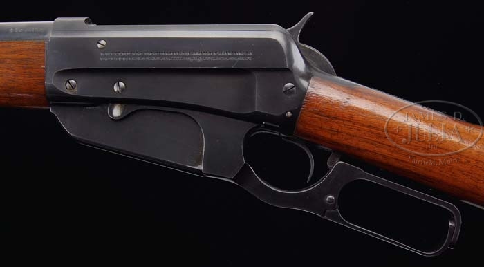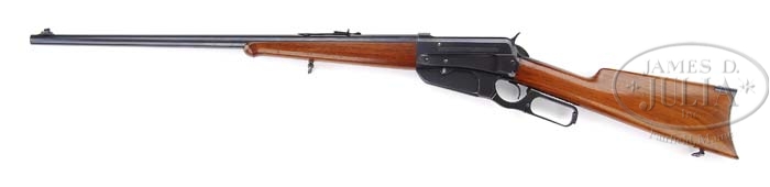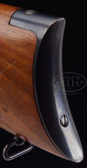 *MINTY WINCHESTER MODEL 95 STANDARD GRADE LEVER ACTION RIFLE. SN 406149. Cal 405 WCF. 24″ rnd bbl, pedestal front with dovetail blade sight, flat top “V” notch sporting rear. Left side of bbl at rear sight is marked “NICKEL STEEL BARREL/ESPECIALLY FOR SMOKELESS POWDER” adjacent receiver is caliber marked “405 W.C.F.” Standard Model 95 receiver with left side marked “MANUFACTURED BY THE WINCHESTER REPEATING ARMS CO.NEW HAVEN. CONN. U.S.A/PATENTED NOV.5.95.NOV.12.95.AUG.17.87.JAN.25.98. AUG.23.99.AUG.6.1907”. Top tang is marked “MODEL 95/WINCHESTER/ TRADE MARK REG.U.S.PAT.OFF & FGN”. Mounted with nicely figured walnut, uncheckered schnable forend with ebony tip insert, restraining screw replaced with sling swivel stud and closed loop swivel, uncheckered straight grip stock, steel crescent buttplate, and sling swivel stud with closed loop swivel 2-1/2″ from toe. CONDITION: Extremely fine. Bbls retains 98-99% orig blue with just a few minor light handling marks. Receiver retains 97-98% orig blue with minor silvering on ears of lever, some minor handling marks, and faint scratching on bottom of mag box and lever. Stock is sound with some minor shallow handling marks, faint scratches, and retains most of its orig factory finish. Buttplate retains most of its orig blue with some faint silvering at heel and toe. Forend is sound with minor handling marks a couple faint scratches and retains most of its orig factory finish. Mechanics are crisp with bright shiny bore as gun appears to be not much more than test fired only. 4-38088 (8,000-10,000)