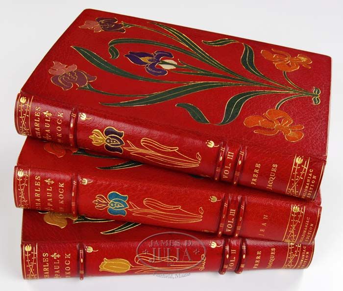THREE ART NOUVEAU LEATHER BOUND VOLUMES OF THE WORKS OF CHARLES PAUL DE KOCK, BIBLIOMANIAC EDITION 1903. Bibliomaniac edition of the works of Charles Paul De Kock in 100 volumes. Limited to 10 numbered and registered sets. Copyrighted and published by the Frederick J. Quimby Company, Boston/Paris/London, 1903. Introduction by Jules Claretie. Translated into English by Mary Hanford Ford. Each volume a numbered limited edition and so marked. Bound in burgundy hand-tooled leather, decorated overall with iris in the art nouveau fashion, the pages uncut, the title page, frontice page, etc., all heightened with hand done watercolors of the period. Each volume with original engravings and watercolors executed for this edition by various artists including, John Sloan, William Glackens, James Preston, Louis Meynelle, et al. Each volume fitted in its original custom conforming box. This lot consists of “Frère Jacques” volume 2, set 5, “Frère Jacques” volume 3, set 5, “Jean” volume 3, set 5. PROVENANCE: Given as a gift by John Sloan to the grandmother and fellow artist of the current owner, by descent through the family. CONDITION: Very fine unused condition with slight wear and fading to boxes. One book box missing clasps. 9-74927 LG (2,000-4,000)