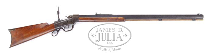 MARLIN BALLARD PACIFIC SINGLE SHOT RIFLE. SN 14185. Cal. 40-90 Everlasting 2-15/16″. Scarce Ballard rifle with 30″ oct bbl, 1″ across the flats at the muzzle. It has a rare ivory insert, iron, Rocky Mtn. front sight, Marlin semi-buckhorn rear sight & a mid-range tang sight with 3″ staff. Receiver has dbl set triggers & a ring lever. Bottom flat of bbl has the very distinctive feature of two iron guides containing a replacement brass tipped wiping rod. Mounted with nicely figured, slab-sawed, uncheckered American walnut with semi-schnable forearm secured with a single screw through small iron escutcheons & a straight stock with crescent buttplate. PROVENANCE: Leland Clapp Collection. CONDITION: Very good. Bbl retains 70-75% strong orig blue with scattered pitting & a large area of pitting on left side of bbl and across bottom flats. Receiver is a mottled silver/gray patina with traces of silvered case colors. Stock has the obligatory cracks in wrist with a gouge & crack in left side of bbl channel of forearm and missing a small sliver from left tip of forearm, otherwise wood is sound with forearm a hand worn patina and buttstock retains about 90% orig varnish. Mechanics are fine, bright shiny bore. 4-36043 JR39 (3,500-5,000)
