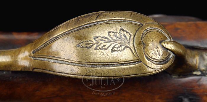 SCARCE REVOLUTIONARY WAR PERIOD MILITIA USED CLUB BUTT FOWLER SN NSN. Cal. 70. Heavily Dutch influenced fowler with 42” rnd bbl, 57-1/2” overall, with bayonet lug at top of muzzle & forestock reduced in length to accommodate bayonet. It has a reinforced breech area with a British style tapered tang. It has an import lock 5” x 1”, slightly curved with a short teat at rear and bridled frizzen with flat side, bevel-edged gooseneck hammer. There is a vertical groove at rear edge. Mounted in a 1-pc cherry stock with brass furniture having three guides containing a very old homemade hickory ramrod with a brass band at tip. Made without sideplate and has an 11” long trigger guard with finger rest and a 1-1/8” wide swell in trigger bow with incised lines and engraved leaves. The two front tang screws are missing and it has an old hand forged staple to secure front end and has a museum number in ink. There is a forged repair back of rear screw hole with breaks in bottom tang. It has a short thick buttstock with fluted comb & a smooth brass buttplate with stepped top tang that has an engraved end and an old rosehead nail securing tip. Trigger is hand forged and rather wide with a full curl at tip. CONDITION: Good. Iron retains a very dark brown patina with moderate pitting. Brass has a medium to dark patina with ramrod guides showing heavy wear with some losses. Buttplate is worn through at heel with nails holding it together. Stock has several grain checks in butt with chips & cracks elsewhere and retains most of an old restored finish. There is heavy burnout behind pan. Mechanics are fine. 4-32711 JR560 (1,500-2,000)