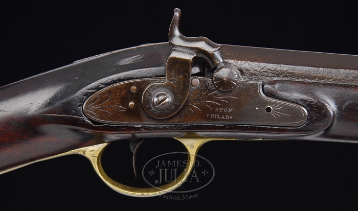 AMERICAN MADE PERCUSSION FOWLER. SN NSN. Cal. approximately 10ga. 47″ bbl is salvaged from an early French musket, showing remnants of the French proofs on the bbl. Stocked in American walnut with a “Tryon Philadephia” marked percussion lock. Brass mounted and bbl is pin fastened. Ramrod appears to be orig. PROVENANCE: R. Sadler Collection. CONDITION: Very Good. Minor handling marks and wood loss around lock, not detracting from overall gun. Very light pitting on right side of bbl and in front of side drum. 4-31980 PS24 (1,200-1,800)