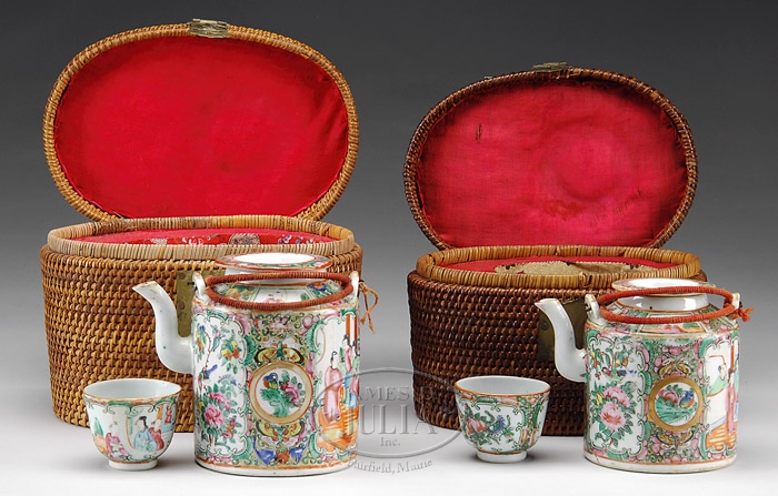 TWO FAMILLE-ROSE TEAPOTS AND CUPS FITTED IN OVAL BASKETS. Second half 19th century. Each drum-form pot with lid and wrapped wire handles, accompanied by tea bowl, fitted in oval basket. SIZE: First:5-1/2″ x 9″. Second:6-1/4″ x 9-1/2″. PROVENANCE: From a private Pennsylvania collection. CONDITION: Overall very good. 9-92643-20 (500-700)