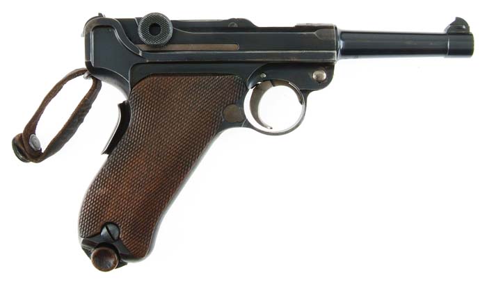 *MODEL 1906 SWISS COMMERCIAL LUGER. Cal. 30 Luger. SN 2352i. Unusual Swiss Luger with 3-7/8” tapered rnd bbl, standard sights, with a Swiss cross & sunburst over chamber and “DWM” marking on toggle link. It has crown “N” proofs on side of receiver, toggle link and bottom of bbl and “GERMANY” vertically on left rear edge of frame. It has full checkered, walnut grips and a standard, wood base magazine that has been after-market numbered to this pistol. It has a grip safety. This pistol is marked like a Swiss military but has attributes of a commercial model and may be an assembled piece using a Swiss receiver, which is unnumbered. The bolt & toggle link are also unnumbered, while rest of pistol is matching numbered. CONDITION: Very good. Overall retains about 80% orig blue, thin on receiver. Frame has slightly thinned front & backstraps with some flaking. Grips are sound showing moderate to heavy wear. Mechanics are fine, bright shiny bore. 4-30841 JR147 (1,500-5,000)