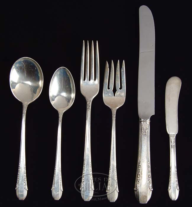 CASED 78-PIECE STERLING FLATWARE SET BY INTERNATIONAL IN THE “ENCHANTRESS” PATTERN. No monogram. Housed in a velvet lined Rogers Bros. case. Set consists of: Thirteen 9” knives; Thirteen 5-1/2” butter knives; Thirteen 7-1/4” forks; Thirteen 6-1/4” forks; Thirteen 6” teaspoons; Thirteen 6-1/2” soup spoons. WEIGHT: 71 tr. oz. CONDITION: Very good. 9-70983 (800-1,200)
