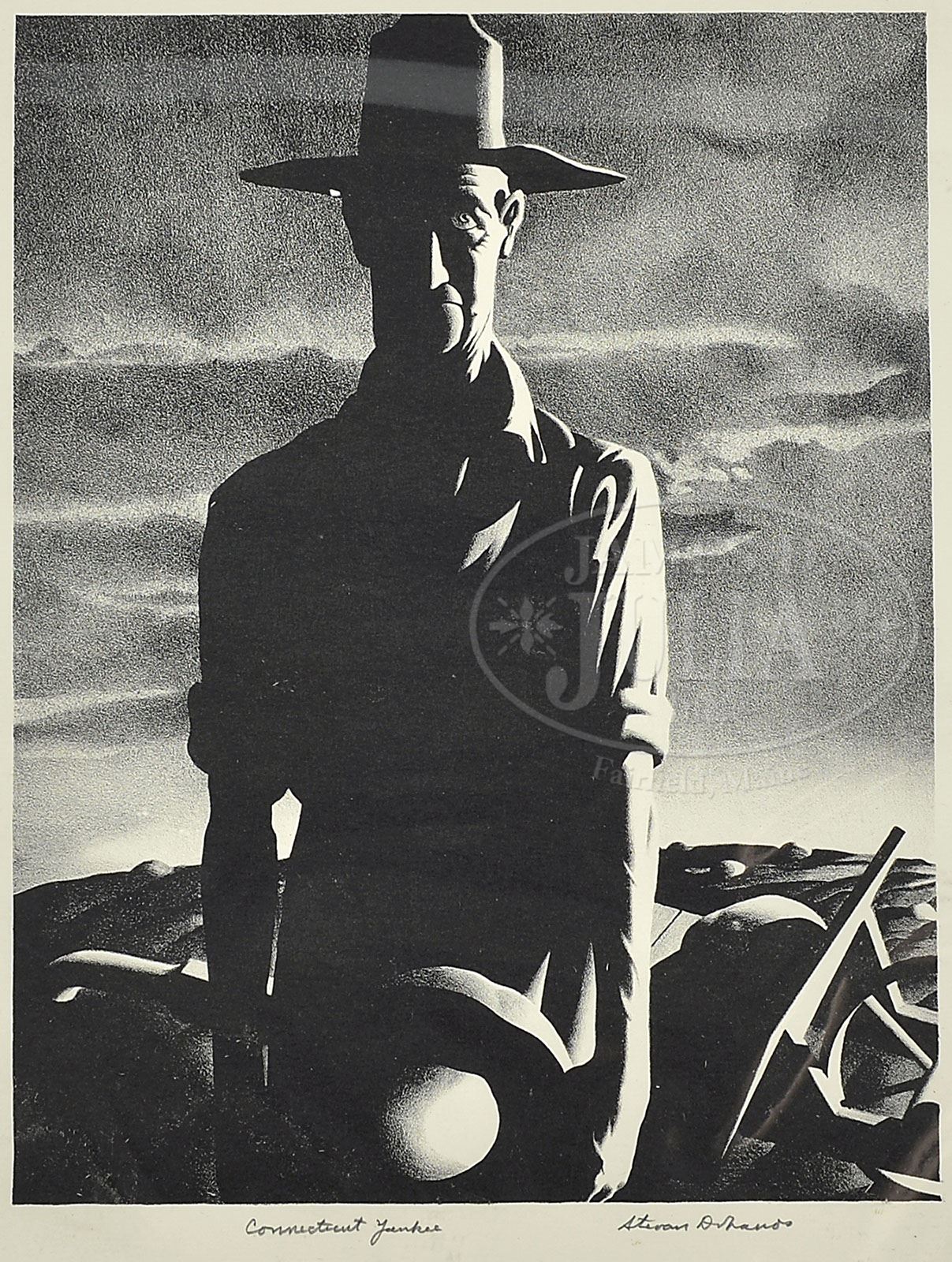 THREE AMERICAN PRINTS (). 1) Alice Standish Buell (American 1892-1964) “Last Load”, framed. Pencil signed and titled. 2) Rockwell Kent (American, 1882-1971) Untitled House, matted. Pencil signed. 3) Stevan Dohanos (American 1907-1994) “Connecticut Yankee”, lithograph, unframed. Pencil signed and titled. SIZE: 1) Sight: 8″ x 10-3/4″. Overall: 14-3/4″ x 18-3/4″. 2) 13-1/4″ x 17″. Overall: 16″ x 20″. 3) 18″ x 13″. CONDITION: Very good overall. 9-29124 (600-800)