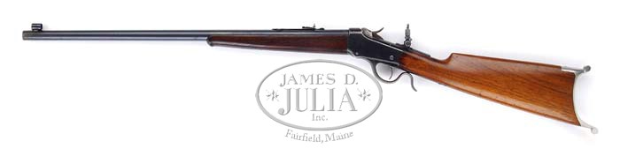 *WINCHESTER LOW WALL WITH BRITISH PROOFS & SWISS BUTT PLATE. SN 100138. Cal. 22 long rifle. No. 1 weight. 24-1/2″ rnd bbl, globe front sight, sporting rear with set screw, coarse knurled post tang-mounted peep. Left side of bbl, receiver & breechblock are stamped with British proofmarks. Mounted with straight grain walnut, uncheckered straight grip with nickel Swiss butt plate, Schnable forend with ebony tip insert. CONDITION: Fine. Bbl retains 85-90% orig blue with some discoloration at muzzle & front sight, a few minor nicks & scratches & some minor scattered fine surface oxidation. Receiver retains 75-80% orig blue, a few nicks & scratches, thinning across top, bottom & sharp edges, blending with silver & brown patina. Stock is sound with some minor scratches & dents, darkening on left side along receiver; retains orig varnish blended with hand-worn patina in grip area. Butt plate retains most of its nickel. Forend is sound, with 2 tiny holes on bottom near receiver, a few minor dents & scratches, retaining dark hand-worn patina. Mechanics are crisp; shiny bore with some minor scattered pitting. 4-35384 BDT261 (2,750-3,250)