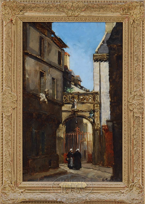 ARTHUR VIDAL DIEHL (American, 1870-1929) CONVERSATION AT THE GATE. Oil on canvas scene of a Dutch cityscape with two women in front of a large iron gate set in an archway entrance. Tall stucco buildings flank the blue sky. Signed lower right. Housed in what appears to be its original gilt French style frame and having a gilt artist plaque. SIZE: 19″ x 12″. CONDITION: Very good with one small touch-up spot in sky. 9-98832 (1,200-1,600)