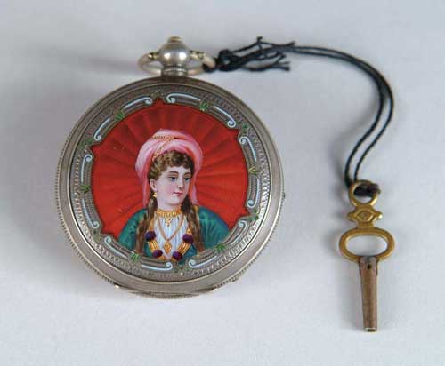 FINE ENAMEL DECORATED POCKET WATCH. French keywind movement, key present. The front dial marked “Patent”. Hallmarked case 1875? The front cover having enamel portrait of a young girl in bright colored costume behind a red engine turned background. The border with scrolls and green leaves and chase design. The back with red enamel work and same border. SIZE: 2” diameter overall CONDITION: Unknown working condition, back enamel has 1/4” square area missing. A very attractive watch. 9-97994 (300-500)