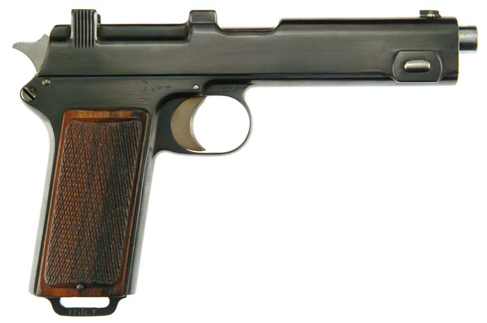 *STEYR-HAHN PARABELLUM SEMI AUTOMATIC PISTOL WITH DROP HOLSTER. Cal. 9mmP. SN 312S. 5-1/8” rnd bbl. Dated 1917 on left side of slide with eagle and triangle issue marks on left side of frame. “W-n, eagle, 17” on right side of triggerguard. Left side of slide is marked “08”. Right side of frame has eagle swastika / L placemark. Lanyard loop at butt is marked “LGK.T”. Left side is numbered 401. “K” assembly numbers on many parts. Entire pistol was refinished when converted to Luger cal. Police drop holster is heavy brown leather and has no markings. Holster is dated 1938. CONDITION: Retains most of the refinish blue. Grips have minor handling marks. Holster has minor cracks on straps. 4-31146 FS255 (2,000-2,500)