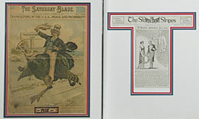 A NEWSPAPER CLIPPING FOR THE STARS AND STRIPES ND THE SATURDAY BLADE – NEWSPAPER FRONT PAGE. 1.) May 24, 1918. “In France- Memorial Day 1918”. Uncle Sam and Lady Liberty with a ghost image of Abraham Lincoln. Text of the Gettysburg Address below. 2.) “Thanksgiving in the USA – Peace and Prosperity.” Chicago. Full front page. November 20, 1915. Artist A. Bowles. SIZE: 2.) 22″ x 28″. CONDITION: The Saturday Blade has fraying at edges, water stained, wear holes at folds, the stone litho is generally in good condition. 1-26753, 1-27458 (250-300) Auction: Advertising, Toy & Doll - Fall 2001 Please Note: All prices include the hammer price plus the buyer’s premium, which is paid by the buyer as part of the purchase price. The prices noted here after the auction are considered unofficial and do not become official until after the 46th day. |