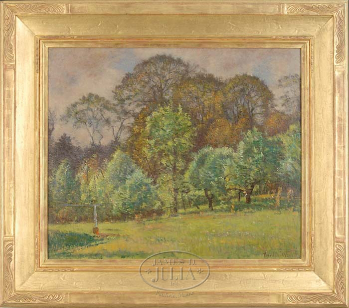 THEODORE M. WENDEL (American, 1859-1932) “SUNNY FIELD”. Large oil on canvas summer scene shows a green grass field leading to the edge of a wooded area. Circa 1915. Signed lower right “Theodore Wendel”. Housed in a magnificent carved wood gilt replacement frame having a stamp from the Frame Guild of Rhode Island. A fine work by this accomplished artist. SIZE: 25” x 30”. CONDITION: Very good. 9-71530 (7,000-10,000)
