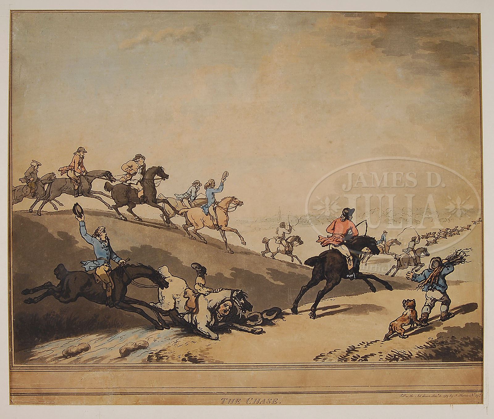 FIVE ENGLISH HUNTING & HORSE RELATED ENGRAVINGS (). 1) “The Reading Telegraph Coaches, Meeting Near Salt Hill” London, Published 1835 by Robert Havell 2) “Fox Hunting, Digging Out” After a painting by H. Alken Engraved by I Clark 3) “Coursing” London, Published 1791 by T. Simpson 4) “Bulldogs & Badger” After a painting by Town Engraved by Earlom 5) “The Chase” Published 1787 by I. Harris SIZE: 1) 15-1/4″ x 22″ 2) 12″ x 17-1/2″ 3) 12-1/2″ x 15″ 4) 21-1/2″ x 25-1/2″ 5) 18″ x 21″ PROVENANCE: Private Montclair, NJ home CONDITION: #4 with foxing line & margin tears, #5 with all over toning. Otherwise good 9-28301, 9-28301×6 is NOT included in this lot! (800-1,200)