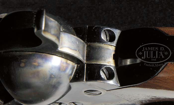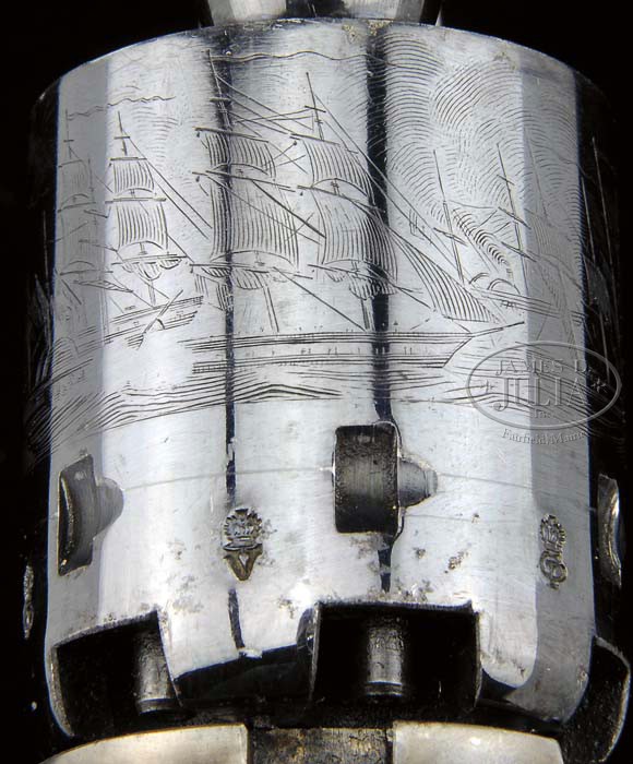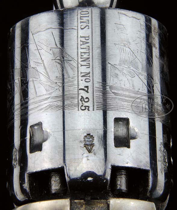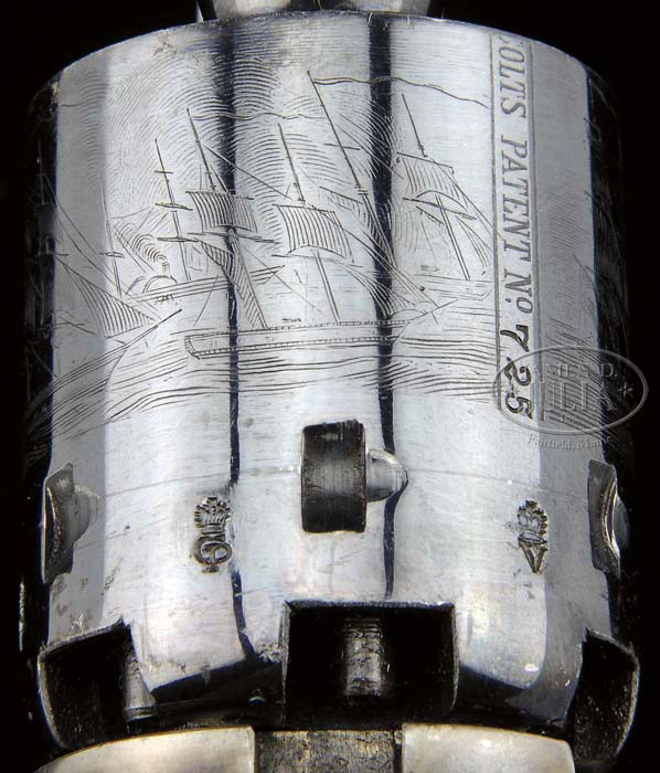 EXCEPTIONAL CASED COLT MODEL 1861 NAVY PERCUSSION REVOLVER. SN 19725. Cal. 36. Blue & color case hardened with 7-1/2″ bbl, German silver front sight and 1-line New-York U.S. America address. Left side of frame has a small “COLTS PATENT” and the caliber is marked on left shoulder of trigger guard. The blued steel trigger guard & backstrap contain a varnished 1-pc walnut grip with last four digits of SN in backstrap channel. This revolver has extra polish finish which resulted in a lightened bbl address. Bbl & cyl have small English proofs. Accompanied by an orig English, blue velvet lined, mahogany casing with an empty brass plaque in lid. Inside lid has the London Agency “DIRECTIONS FOR LOADING COLT’S PISTOLS” paper label. The bottom is compartmented for the revolver, a Dixon bag flask, a blued steel “COLT’S PATENT” 2-cavity bullet & ball mold with sprue cutter, a large lacquered tin with Eley Bros. label and a small pewter oil bottle. Rear of case contains an all metal English style cleaning rod. SN on the bbl lug, frame, trigger guard & buttstrap are all accompanied by a small “L” which indicates that even though it was manufactured in Hartford, this revolver was destined for the London market. According to Flayderman’s Guide to Antique American Firearms only 38,843 of these fine revolvers were produced in the period 1861 through about 1873. They generally saw extreme hard service throughout their working lives well into the 1870’s before being supplanted by self-contained cartridge revolvers, usually under adverse conditions with little or no maintenance. Those sold on the English Market were usually purchased by military officers who used them continuously throughout the military campaigns in the far-flung British Empire. Again they were mostly used in very adverse circumstances with limited or no maintenance and today are very rarely found with high orig finish. Even fewer are found in an orig Colt Agency casing. This revolver is pictured on p. 150 of the book The Wm. M. Locke Collection, Sellers, as part of a cased 2-gun set with a pocket Navy revolver. When the Locke Collection was sold upon Mr. Locke’s death, the cased 2-gun set was acquired by Greg Martin who separated this revolver and placed it in this case. Accompanied by letters from Greg Martin, Herb Glass and Mike Clark/Paul Sorrel certifying the originality of this revolver. PROVENANCE: William Locke Collection; Greg Martin; Andy Monty Collection; David Condon; Mr. McGinnis Collection; Mike Clark, Collectors Firearms 1992; Robert Howard Estate Collection. CONDITION: Extraordinarily fine plus, all matching including wedge, cyl & grip. The bbl, cyl & grip frame retain bright glossy orig blue showing only faint sharp edge wear. The rammer handle, hammer & frame retain virtually all of their orig brilliant case colors. Grip is sound with only one or two very minor mars and retains virtually all of its strong orig factory varnish. Mechanics are crisp, brilliant shiny bore, almost certainly unfired. The chambers of the cyl & bore retain virtually all of their orig factory blue and the cyl has five of its six safety pins crisp & serviceable. Cyl retains about 99% strong Ormsby Naval Battle scene. Case is sound with light handling & storage marks and retains most of its orig finish. Interior is lightly faded & soiled with yellowed label and solid partitions. Flask & mold retain about all of their orig factory finish. Cleaning rod is most unusual in that it retains about 99% orig factory blue. Altogether an extraordinary & rare set in extraordinary condition. 4-45382 JR58 (20,000-30,000)