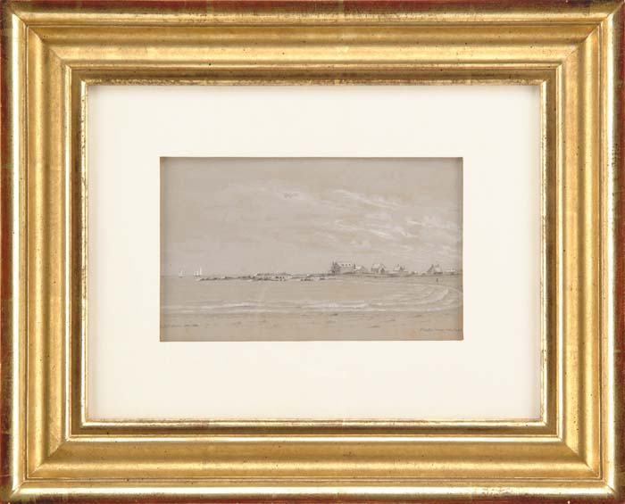 CHARLES B FULLER (American, 1821-1893) “ATLANTIC HOUSE, WELLS BEACH”. Drawing on gray paper with china white highlights shows several houses at point of land with beach and sailboats. Signed lower left in pencil “CB Fuller Jan 1860” and titled on right side. Housed in a fine gold leaf replacement molded wood frame with white matte with a Guido Frame Studio label. SIGHT SIZE: 4-1/4” x 7-1/4”. CONDITION: Very good. 9-72146 (900-1,200)