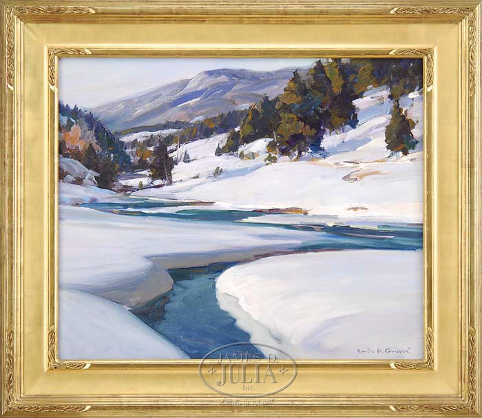 EMILE ALBERT GRUPPE (American, 1896-1978) “VERMONT WINTER”. Oil on canvas Vermont winter scene shows a winding river with snow covered banks leading to hillside and mountain with evergreens. Signed lower right. Housed in a fine carved and gilt wide replacement frame. SIZE: 25″ x 30″. CONDITION: Very good to excellent. 9-95169 (12,000-18,000)