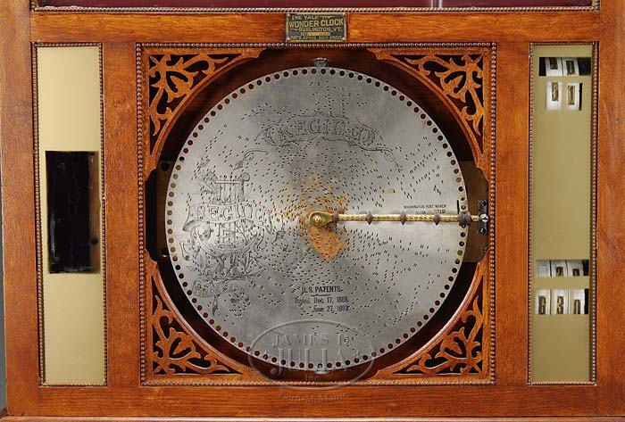 AN EXCEEDINGLY RARE & SPECTACULAR “YALE WONDER CLOCK”. This is an extraordinary opportunity to purchase a “fresh to the market” coin operated machine that not only appeals to music box collectors or collectors of gambling machines but to anyone who wants to own the best of the best!!!! Only on rare occasions does a machine of this magnitude become available to a prospective buyer, with most collectors not even placing a machine of this nature on their “Wish List” as they feel it is an unattainable desire!! This machine was purchased by the current owner over thirty years ago in Vermont from the family of the original owner. Only a handful of this type of machine survived over the years and there are several different versions. This example was manufactured in the first part of the 20th century in Burlington, Vermont by Charles Yale…hence the name. Comparing the few that have survived over the past 100 years this example is perhaps one of the most visually appealing versions as well as one with an exceptionally low serial number 123. Contained within a fanciful oak case is a 15 1/2″ Regina disc player as well as the gambling aspect…a spinning arrow that would stop at various locations on the reverse painted glass with numbers from 000 to 999. Originally designed to navigate around the gambling aspect, the player was supposedly purchasing a tune from the Regina player and gosh golly the gambling aspect was thrown in as a bonus. Another intriguing addition is the revolving display in the front of the machine…used for advertising purposes with which local or national merchants would hawk their goods. This example does not include any of the advertising that would have been used in the center or side windows of the machine. Just standing in front of this machine one must examine the machine closely…..amazing how so many gimmicks/options were employed!!!! The mechanism is mechanical in nature as well as also being run with dry cell batteries for operation of the lighting. A clock by New Haven Clock Company, flashing lights, various token awards, a spinning arrow, music, advertising…what else could have been added to attract a prospective player??? Always a winner, a token was always dispensed with every play, the only variable being the quote “trade value” of the token. Without a doubt the “hidden” gambling aspect was present, the total of your number that the arrow stopped on (#256 really meant 2+5+6=13) was awarded accordingly to the merchant and the value he would place on the number you achieved. Obviously a high number or a low number had the greatest value, much harder to achieve these results; just compare this to playing “craps”… rolling a seven is easy compared to rolling “boxcars” which would be extremely difficult. Hence following through on this premise the awards would be comparable, low or high total would have the greatest value and receive the greatest trade or monetary reward. Original manufacturing plaque is attached at the center above the disc changer. It reads “The Yale Wonder Clock Burlington, VT. No. 123 Pat’d April 10,1900”. Reverse painted glass on side states “The Yale Wonder Clock Pat’d April 10, 1900 Other Patents Pend’g Pays Full Value For Each Nickel Played Get Ticket Out Of Cup”. Original crank and original Edison light bulbs. This opportunity may never come up again as this machine is so rare and considered to be the earliest known example with the lowest serial number on record. To see more about the Yale Wonder Clock please see David Bowers wonderful article in the Musical Box Society Mechanical Music, Vol. 53, No. 3. SIZE: 94-1/2″ h x 13-1/2″ at deepest x 34″ at widest. PROVENANCE: Purchased by our consignor over 30 years ago in Vermont from the family of the original owner. CONDITION: Recent cleaning and both old and recent restoration includes some replaced wood trim, exterior finish and paint restoration, as well as some elements of the face. Two front glass pieces are fabulous recreations of the original inserts (the original broken door glass will accompany this lot). Side glass is original. Oak top wood facade is a recreation. Mechanism is functional and appears to be intact and complete including the electrical wires running from the clock to the lights. The batteries are present but the power requires two drops of mercury, which is not present, and is needed to complete the connection. 1-7700 (75,000-125,000)
