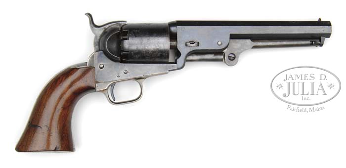 VERY RARE COLT MODEL 1851 NAVY PERCUSSION REVOLVER 3RD MODEL WITH 6″ BARREL. SN 11489. Cal. 36. Blue & color case hardened with 6-1/16″ oct bbl, brass pin front sight and 1-line New York City address. Left side of frame has tiny “COLTS PATENT” and the small guard silver plated brass trigger guard & backstrap contain a varnished 1-pc walnut grip with last four digits of matching SN in backstrap channel. Cyl is usual 6-shots with Ormsby Naval Battle scene roll marking and all six safety pins crisp & serviceable. Some of the nipples have the “COLT” marking on the side flats. There are small inspector initials on some of the parts. Left side of frame has a hairline crack below the trigger screw hole. Very few of these short bbl Navys were produced and few of those survive today. This exact revolver, identified by SN, is pictured in color on p. 120 and again as item C on p. 122 of The Book of Colt Firearms, Third Edition, Wilson. The caption on p. 122 states that another such specimen is known, SN 186027, implying that there are only 2 known specimens with factory short bbls. PROVENANCE: David Bichrest (1997); Robert Howard Estate Collection. CONDITION: Very fine, all matching including wedge, cyl & grip. Bbl retains most of an old restored finish. Rammer & rammer handle retain faded orig case colors. Muzzle flat shows fine pitting with some light cleaning marks. Frame retains 75-80% faded case colors with a couple of forging flaws in the left side and on the left recoil shield. Trigger guard & back strap retain virtually all of their fine silver plated finish. Cyl retains about 75% thin blue and about 95% Ormsby Naval Battle scene roll marking. First 1/2″ of the chambers of the cyl have been cleaned. Grip is sound with a few light dings and scratches and a couple of bruises on right side and overall retains most of its orig strong varnish. Mechanics are crisp, brilliant shiny bore. 4-45254 JR38 (5,000-8,000)