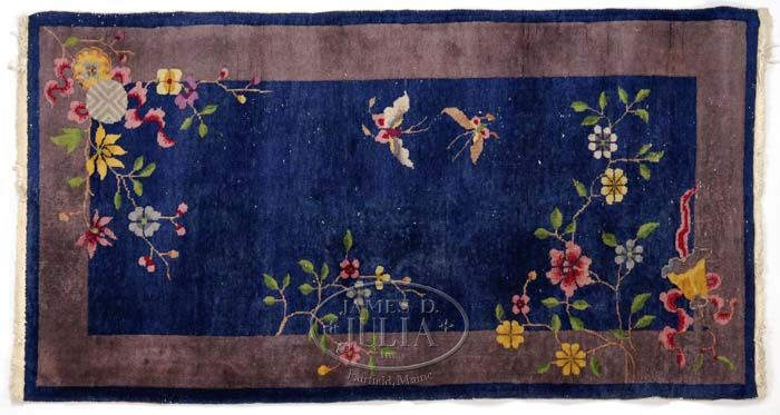 CHINESE ORIENTAL RUG. With delicate floral sprays and fanciful butterflies on a medium indigo ground within a coffee border. PROVENANCE: Fine private Long Island, New York mansion. SIZE: 5’9” x 3’1”. CONDITION: Spots of minor wear throughout, retains good color and pile. 9-74183 SM (150-300)