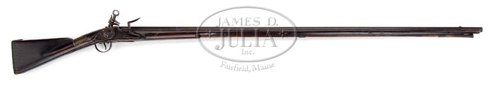 UNUSUAL COMPOSITE AMERICAN FRENCH & INDIAN WARS FLINTLOCK MUSKET SN NSN. Cal. 70. Early American assembled flintlock, 52” oct to rnd bbl, tiny Kentucky rifle style front sight with very early Grenadier lock, 6-5/8” long with a medium teat having a bridled frizzen and flat side, bevel-edged hammer with a distinctive jaw screw that has a ring in top. It has a hand forged iron trigger guard with wide straight trigger that has a curl at the end and flat iron buttplate, both secured with hand forged nails. Mounted in an American made full length walnut stock with two brass guides containing a hickory ramrod. At one time it must have had a thin sideplate which is now missing. There is an old repair around wrist using sheet brass that is lightly decorated. CONDITION: Fair. Iron retains a very dark brown patina with moderate to heavy pitting and shows heavy wear. Stock has nicks, dings & cracks, also shows heavy wear with some losses from bbl channel of forestock. There appears to have been some repairs in forestock. It has losses around top tang with burnout fore & aft of the pan and has some wood fill in toe & side of butt. Mechanics are fine. 4-32706 JR564 (2,000-2,500)