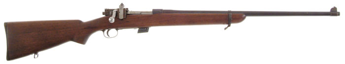 *SPRINGFIELD MODEL 1922. Cal. 22. SN 1893. This is a nice rifle. It is not what one would call mint, but it does appear to be orig. It retains orig 1922 dual firing pin bolt, as well as 2 proper magazines and spare parts. The rifle appears to be used but not abused with some honest wear on it which is acceptable considering the rarity of and unaltered 1922 action. The bbl date is “1-23” CONDITION: Barreled action retains better than 90% of its blue but there are some areas of poor storage. There are also, just above the ELD in the nomenclature, a small, approx. 1/4-3/8” rnd area, of bare metal. There is the same area in size, approx. 3 1/2” forward on the bbl. I have no explanation for this other than they are there. Lyman 48 receiver sight shows about 50% orig finish. Orig 1922 nickel steel bolt is polished with some patina starting to turn on the body. Floorplate assembly and trigger guard show significant wear with the possibility of being touched up a little bit at some time. Buttstock is of the non-finger grooved variety with the large 1922 bordered in checkered buttplate. Front bbl band shows about 60% blue turning plumb. Bore is excellent and mechanics are perfect. This a very acceptable example of an orig 1922 that isn’t mint so you wouldn’t mind shooting it. Edwards Collection 4-58528 58BK30 (1,000-1,500)