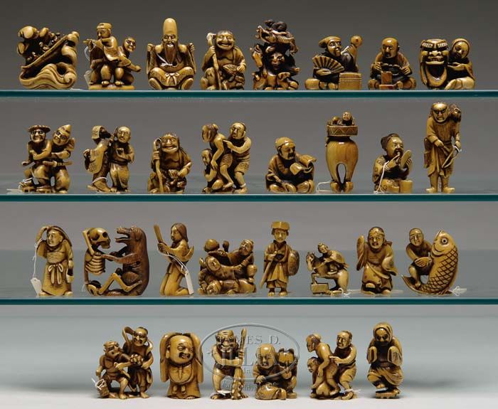 TWO CASED SETS OF IVORY NETSUKES. Mid-20th Century collection contains 30 carved and patinated ivory Netsukes. All are signed and come with a description of each and reference in books. Housed in black leather type cases with blue material interiors. SIZE: Average is 2” h. CONDITION: Very good. 9-71462 (800-1,200)