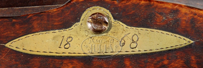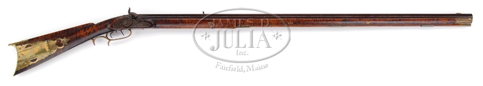 PERCUSSION FULL STOCK VIRGINIA KENTUCKY RIFLE. Cal. 45. 42-3/4″ full oct bbl. This rifle has a 4-pc brass patchbox with three piercings and the finial has a 4-petal Virginia flower and a heart shaped piercing. The percussion lock is marked “J. Tarratt & Sons”. Silver engraved oval cheekpiece inlay and a brass sgl screw sideplate dated 1868. The rifle has an 8″ long brass toeplate held in place by five wood screws and the rifle features dbl set triggers. The bbl tang is 5″ in length, extending well into the wrist area. This rifle has been attributed to Amos or Jacob Fischer by the consignor and does appear to be the work of the Fischer family in Lynchburg, VA. The rifling is deep and clean, the interior of the bbl being in good shape. CONDITION: Evidence of a crack in the wrist area of the stock which may have been reinforced by the addition of a longer bbl tang. Small pc of wood has been burned away behind the percussion nipple. Otherwise the entire gun is solid and clean with only normal wear throughout. 4-32751 RG5 (2,500-3,500)