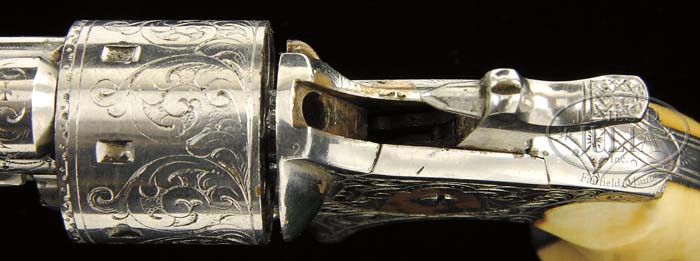 RARE ENGRAVED EARLY PRODUCTION COLT OPEN TOP POCKET MODEL REVOLVER. SN 247. Cal. 22 Short. Nickel finish with 2-7/8″ rnd bbl, half moon front sight and 1-line address with ejector housing on right side. It has high spur hammer with the extremely rare feature of a tapered rnd firing pin which strikes through a rnd hole in frame vs. the slot type firing pin found on the majority of production. Mounted with smooth 2-pc birdhead ivory grips. Revolver is nicely engraved with about 60% coverage foliate arabesque patterns on frame with geometric patterns down backstrap. Engraving extends over sides of bbl with an arrow pointing from front sight toward the cyl. Cyl is engraved to match. Although this model was produced in fairly large numbers this particular variation is extremely rare and seldom encountered. PROVENANCE: Harrison Carroll (2003); Robert Howard Estate Collection. CONDITION: Fine to very fine. Bbl & cyl retain virtually all of their strong orig nickel finish; frame retains 88-90% nickel finish with the loss areas flaked, not worn, showing a medium mustard patina; grips are sound with wonderful golden ivory patina. Mechanics are fine, strong bright bore with a couple of scattered spots of light pitting. 4-45335 JR146 (3,000-5,000)