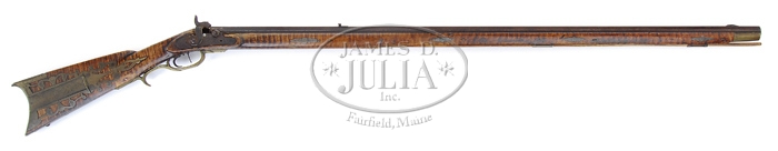 J. TEAFF CONVERSION FULL STOCK KENTUCKY RIFLE SN NSN. Cal. 40. Fine Ohio made full stock Kentucky with 41-1/2” oct bbl, small silver front sight and fixed rear sight. Maker’s name is on top flat. Lockplate & hammer are replacements and unmarked and conversion is a rnd bolster type. Mounted in a full length maple stock with four wedges and three faceted brass guides containing a replacement hickory ramrod. Each side of forestock has four 2-1/4” long silver inlays of overlapping circles. Butt has a shallow cheekpiece with a 2-3/4” x 1-1/4” oval silver inlay having a wonderfully engraved perching American eagle. Right side of butt has an extraordinary 4-pc filigree brass patchbox that is about 9-3/4” long and is very nicely engraved with spring loaded lid. It has a blank oval thumbplate and a short, stylish brass sideplate with rectangular pierced center. It has dbl set triggers and an unusual brass trigger guard that is diamond shaped in cross section. James Teaff was a rifle maker in Steubenville, Ohio, a Mexican War veteran and was active until at least 1865, Small Arms Makers, Gardner. CONDITION: Good. Bbl retains a very dark heavy brown patina with fine pitting over most of surface, heavy around bolster. There is heavy burnout in front & back of nipple area. Lockplate & hammer are also a very dark rusty brown patina. Stock has worm holes on left side of butt with a few more on forestock and retains about 60% of its applied striping. Hammer is very loose and will not catch at half or full cock. Set triggers function fine. 4-32842 JR605 (3,500-5,000)