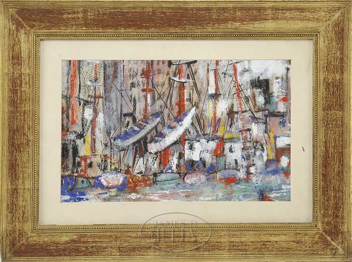 VACLAV VYTLACIL (American, 1892-1984) HARBOR BOATS. Mixed media harbor scene shows five boats lined up in a row, side by side, with buildings in the background. Colorful red masts and buildings. Signed lower left. Housed in an gilt oak period frame with beige liner. SIZE: Sight: 10-1/2″ x 17-1/4″. CONDITION: Very good. 9-20198 (1,000-1,500)
