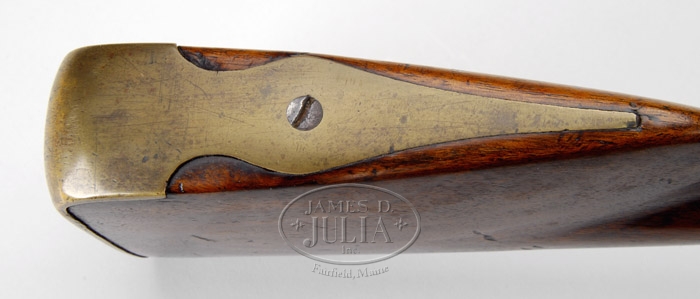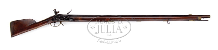 FINE REVOLUTIONARY WAR PERIOD POTSDAM HESSIAN FLINTLOCK MUSKET. SN NSN.. Cal. 75. Wonderful Hessian musket with 44” rnd bbl, bayonet lug on bottom of muzzle with elongated oval and German silver front sight. It has curved, thick, bevel-edged lockplate with a vertical line behind hammer and a short teat, engraved in front of hammer “POTZDAMMAGAZ”. Mounted in a 1-pc walnut stock with club butt and high comb with all brass furniture with raised teardrop side panels with raised carving around top tang and nosepipe with a raised groove on each side of ramrod channel. It has four brass guides that contain a skinny trumpet head ramrod. The very long (12”) trigger guard has a sling wire with a corresponding wire in forestock. It has an oval thumb plate with a smooth brass buttplate and spearpoint top tang. Stock is spliced just in front of raised side panels which appears to be an orig arsenal splice. CONDITION: Fine to very fine. Appears to be all orig with metal retaining a very dark smooth brown patina with some touch-up toward muzzle end. Lockplate & hammer also retain a very dark patina. Brass is a dark mustard patina. Stock, spliced as noted, retains a wonderful smooth hand worn patina with light handling & use marks. Mechanics are crisp. 4-32599 (6,000-10,000)