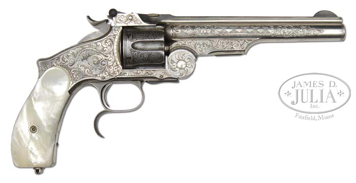 RARE ENGRAVED SMITH & WESSON NO. 3 THIRD MODEL RUSSIAN SINGLE ACTION REVOLVER. SN 41568. Cal. 44 Russian. Nickel finish with 6-1/2″ keyhole shape bbl, integral front sight with fixed rear sight on the bbl latch. Bbl address terminates with the patent date “AUG.24.69” and “RUSSIAN MODEL”. Trigger guard has the distinctive finger rest hook and the buttstrap is mounted with a factory sling swivel stud. It is further mounted with smooth 2-pc pearl grips with last three digits of the matching SN scratched inside each grip. Right heel of grip frame, under the grip, is stamped with assembly number “2412”, which number is also found on rear face of cyl, bbl latch & bbl. Revolver is beautifully engraved by renowned master engraver L.D. Nimschke with nearly full coverage wonderfully executed foliate arabesque patterns with very fine punch dot background. Left side of frame is engraved with the vignette in semi-relief, very well-executed bull elk head with fine stippled background. Right side of frame is engraved with the panel of a fan pattern overlaid with a large foliate arabesque pattern. Engraving extends over the ejector housing and sides of the bbl with each side having a 5-panel diamond pattern. The muzzle is engraved in a fine knurled pattern with identical knurled pattern on rear edge of cylinder. Cyl is also engraved with matching foliate arabesque patterns on the lands between the flutes. Top strap is engraved in diamond & dot patterns with snake & dot patterns surrounding the bbl address. Top edge of frame, behind the hammer, and top of backstrap at the hump are engraved with Mr. Nimschke’s distinctive crossed ribbon patterns. Backstrap is engraved with geometric patterns. Altogether an extremely beautiful and well-engraved, rare Smith & Wesson. According to Flayderman’s Guide to Antique American Firearms there were only 13,500 of these commercial revolvers produced in the period 1874-1878. Of that number very few are known engraved that survive today. This exact revolver is pictured on p. 284 of the book Smith & Wesson 1857-1945, Neal & Jinks, with credit to the Dr. R.L. Moore Collection. Accompanied by a copy of the collection sheet for this revolver from the R.L. Moore, Jr. collection where under “special data” he notes “came out of South Mexico 4/68. Belonged to rancher’s widow of Yucatan.” He lists the date of acquisition as 1968 from Hans Schenke. Also accompanied by a copy of a letter from renowned historian and author R.L. Wilson dated April 16, 1968 to Dr. Moore wherein he verifies the Nimschke engraving. PROVENANCE: Dr. R.L. Moore Collection; Jack Malloy; Robert Howard Estate Collection. CONDITION: Very fine plus, all matching including cyl & grips. Frame & bbl retain about 95% strong orig nickel with some minor wear on hump of frame and around the muzzle. Cyl has traces of nickel in the flutes, otherwise is mostly gray metal color. Hammer & trigger guard retain traces of faded case colors. Grips are sound with great fire. Mechanics are crisp, bright shiny bore shows little evidence of having been used. 4-45284 JR43 (20,000-30,000)