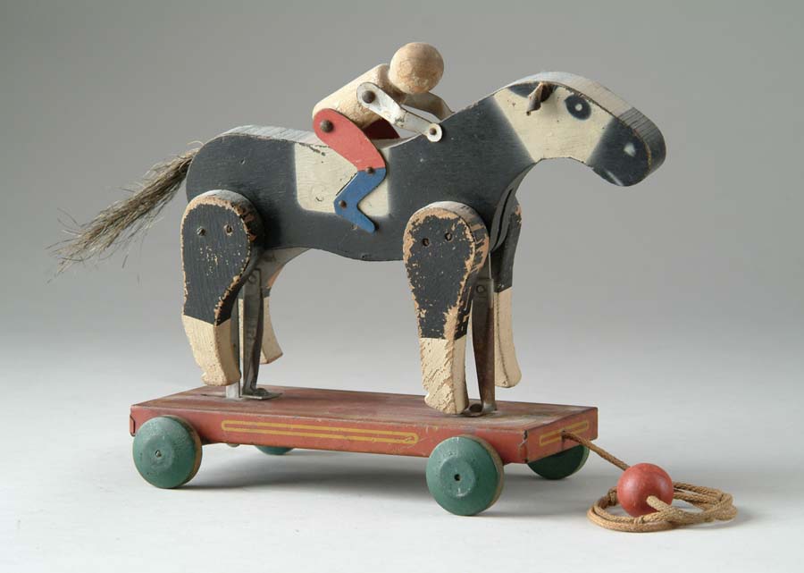HORSE & JOCKEY PULL-TOY. By Hustler Toy Corp., U.S.A. Platform toy has animated wooden horse with jockey rider. SIZE: 9” l. CONDITION: Considerable paint loss to jockey; remainder of toy is good. WP 1-3470 (100-200) Auction: Advertising, Toy & Doll - Spring 2005 Please Note: All prices include the hammer price plus the buyer’s premium, which is paid by the buyer as part of the purchase price. The prices noted here after the auction are considered unofficial and do not become official until after the 46th day. |