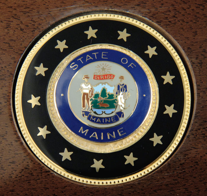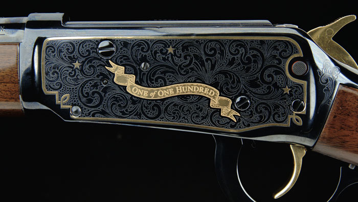 *WINCHESTER AMERICAN HISTORICAL FOUNDATION MAINE 50 STATES COMMEMORATIVE LEVER ACTION CARBINE. Cal. 30-30. SN 6432240 & ME003. Standard angle eject Winchester carbine with 20” rnd bbl, full magazine, ramp front sight missing hood & open rear sight. Mounted with uncheckered, straight grain walnut with straight stock & Winchester embossed black composition buttplate. Receiver, bbl, magazine tube & lever are high polish, bright blue, while bbl bands, magazine plug, trigger & hammer are gold plated. Receiver has full coverage etch engraving on sides with right side inscribed on gold ribbons “MAINE LIMITED EDITION / 1820 / THE ‘PINE TREE STATE’”. It has a gold line border with three stars and outline of State of Maine. Left side has identical gold line border with “ONE OF ONE HUNDRED” also with three stars. Top of bolt has “ME003” in gold. Left side of buttstock has a large 2-layered cloisonné medallion with outer ring having gold edges with thirteen gold stars and the inner ring the seal of The State of Maine in full color. Lever is strapped with a black plastic bundle tie & it has orig hang tag. Accompanied by its orig, glass top, maroon velvet lined, walnut case with a recessed plaque in bottom. Also accompanied by a American Historical Foundation booklet, orig owner’s manual, warranty card & other papers. Case measures 44” x 12-1/2” x 3-1/2”. CONDITION: Pristine new, unfired. Retains virtually all of its orig factory finish to both metal & wood. Case is equally new. 4-58221 (1,500-1,750)