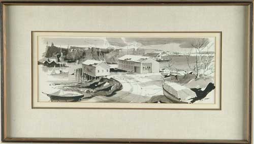 LAURENCE PHILIP SISSON (American, 1928-) “BREWER’S BOATYARD EAST BENECOOK HARBOR, SOUTHPORT, MAINE 1962”. Monochrome watercolor scene shows large boatyard on side of harbor with boats, buildings and water. Original painted wood frame having wide linen matte and two other mattes. Signed lower right “L Sisson”. Titled on reverse. PROVENANCE: Danforth Estate, Cozy Harbor, ME. SIGHT SIZE: 7-1/2” x 20-1/2”. CONDITION: Very good. 9-99124 (300-500)